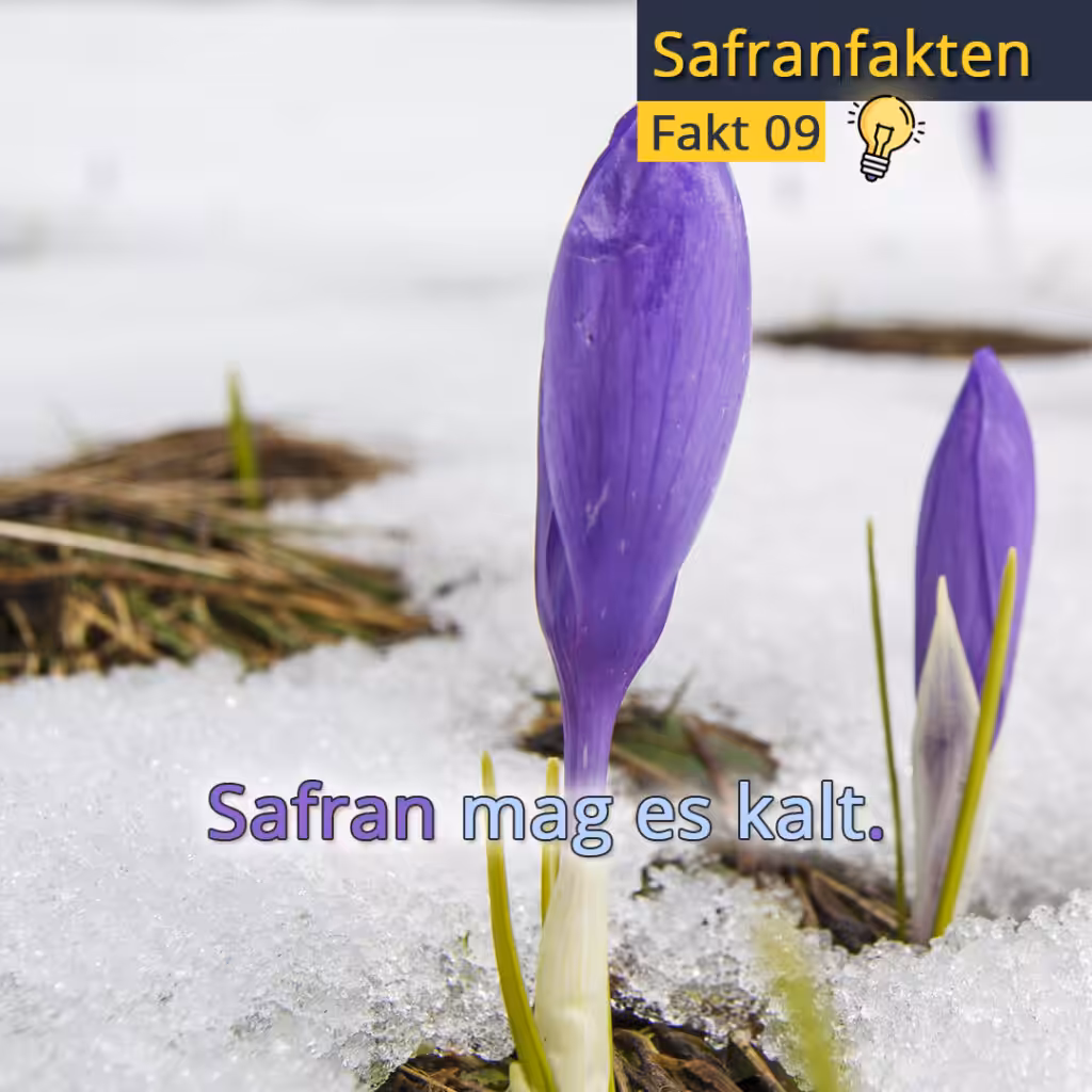 Safran ist eine sogenannte antizyklische Pflanze, das heißt sie schläft im Sommer, wenn normalerweise alles wächst, und wächst im Winter. Im Sommer darf es gerne heiß und trocken sein und im Winter fühlt sich der Safran am wohlsten wenn es kalt ist und Schnee liegt. Der Safran grünt dann auf, selbst wenn er von Schnee bedeckt ist!