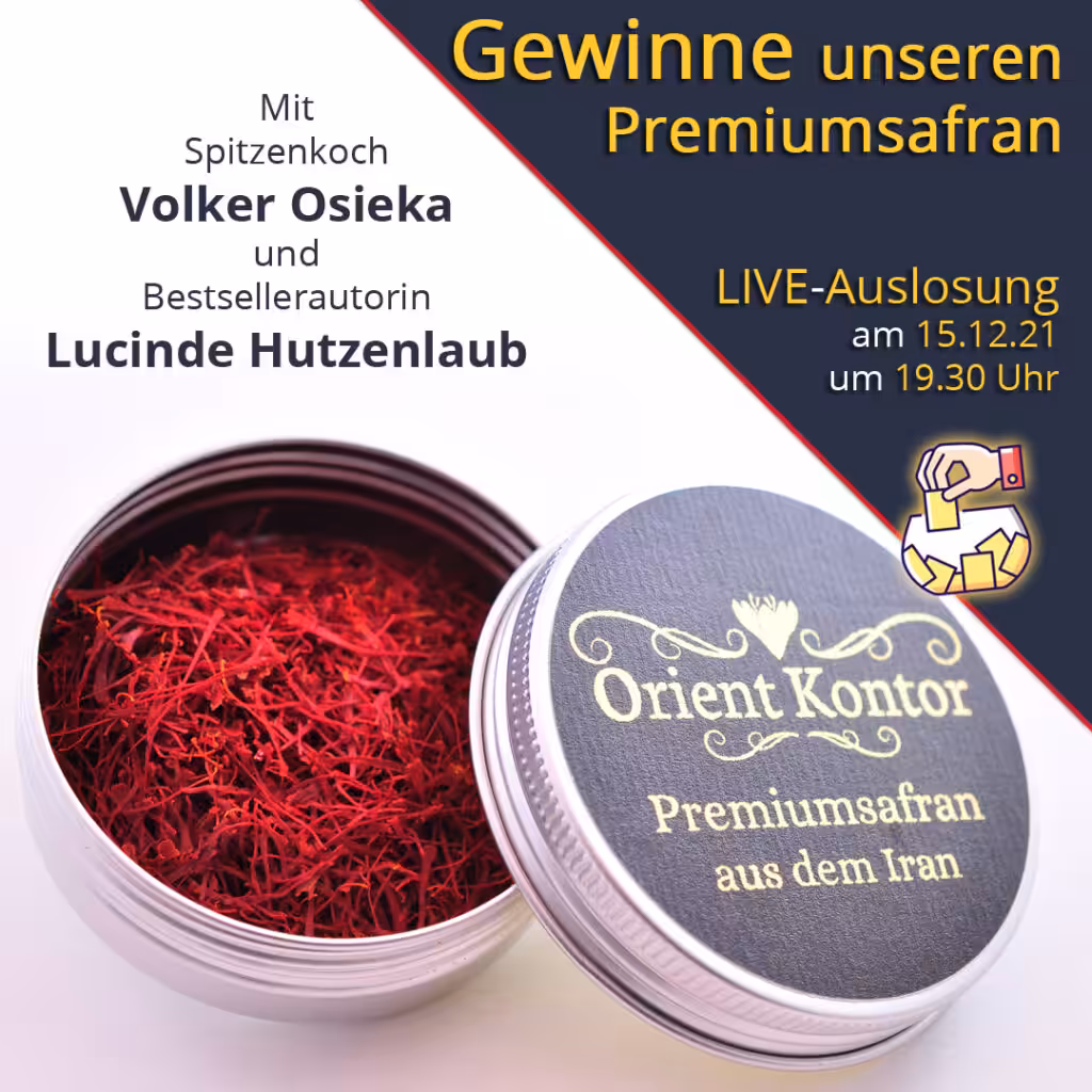 Das Gewinnspiel läuft bis zum 15. Dezember 2021 19:00 Uhr // Unter den Teilnehmenden gewinnt die Person, die unter diesen Post ein Rezept mit Safran gepostet hat und per Zufallsprinzip am 15.12.21 ausgelost wird // Teilnahme ist ab 16 Jahren möglich // Der Gewinn beträgt eine 5g-Dose Premiumsafran aus dem Iran // Den Versand des Gewinns übernimmt Orient Kontor, es sind mit dem Gewinn keine weiteren Kosten verbunden // Das Gewinnspiel steht nur Teilnehmenden aus Deutschland, Österreich oder der Schweiz offen // Gewinner:innen werden über eine PN benachrichtigt und auf dem Facebook und Instagram Kanal von Orient Kontor benannt // Gewinner:innen müssen sich innerhalb von 10 Tagen zurückmelden, sonst verfällt ihr Gewinn // Die Daten der Teilnehmenden werden nur für die Abwicklung des Gewinnspiels verwendet // Teilnehmenden steht im Hinblick auf Ihre Daten Auskunfts-, Änderungs-, Löschungs- und Widerrufsrechte zu // Facebook und Instagram haben mit diesem Gewinnspiel wirtschaftlich und rechtlich nichts zu tun // Alle Anfragen bzgl. des Gewinnspiels sind an Orient Kontor zu richten (info@orient-kontor.com) // Der Rechtsweg ist ausgeschlossen.