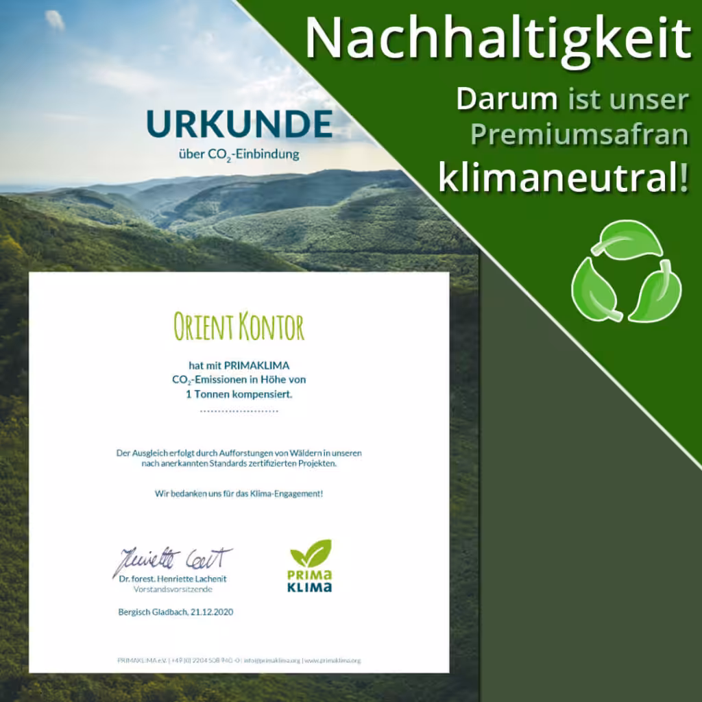 Alle nicht vermeidbare CO2-Emissionen, wie beispielsweise der Transport des Safrans vom Iran nach Deutschland, gleichen wir durch Spenden bei PRIMAKLIMA e.V. aus. Somit unterstützen wir Waldprojekte und Aufforstungen in der ganzen Welt!