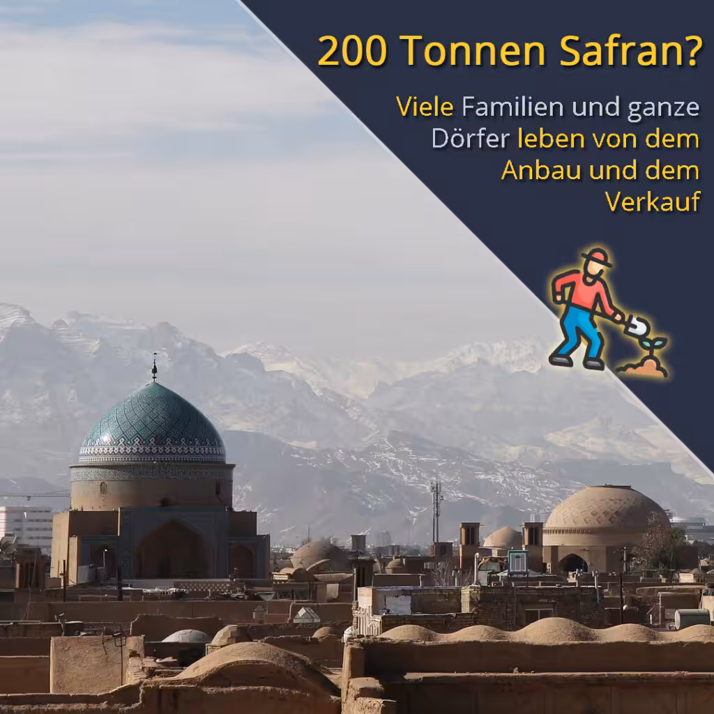 Besonders in der Region Chorasan macht der Safran einen großen Teil der Wirtschaftskraft aus. Viele Familien und ganze Dörfer leben von dem Anbau und dem Verkauf. Aufgrund der komplizierten politischen Lage sowie neuer und alter Sanktionen hat der Iran immer wieder Schwierigkeiten sein Produkt zuverlässig auf dem Weltmarkt anbieten zu können.